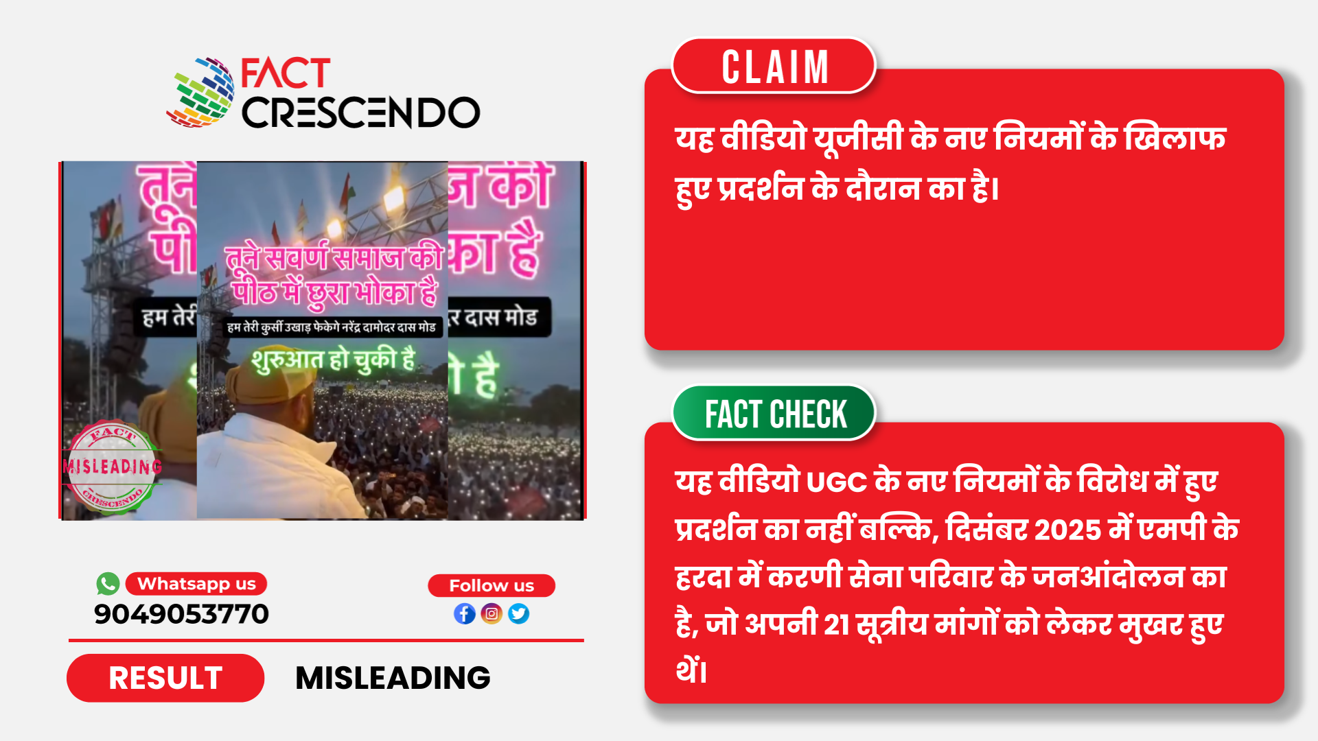 तथ्यों के जांच से यह पता चलता है कि वायरल वीडियो के साथ किया जा रहा दावा गलत है। यह दिसंबर 2025 में मध्य प्रदेश के हरदा में करणी सेना परिवार के जनआंदोलन का वीडियो है। इसका UGC के नए नियमों के खिलाफ विरोध से कोई संबंध नहीं है।
