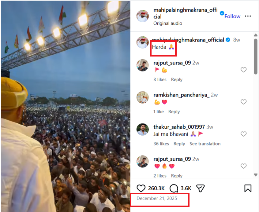 हमने पड़ताल की शुरुआत में वायरल वीडियो के की-फ्रेम को लेकर सर्च करना शुरू किया। परिणाम में हमें यह वीडियो ‘महिपाल सिंह मकराणा’ के सत्यापित इंस्टाग्राम अकाउंट पर 21 दिसंबर 2025 को अपलोड किया हुआ मिला। यहां पर वीडियो को मध्यप्रदेश के हरदा का बताया गया है।