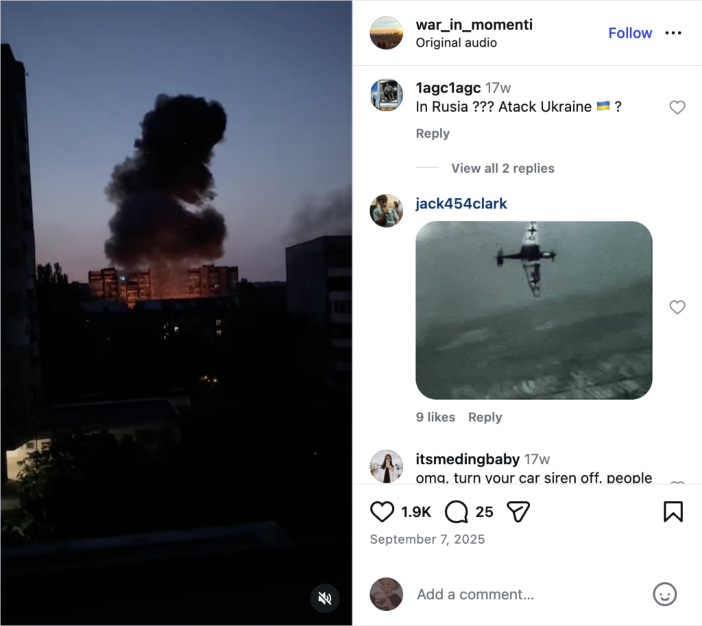 जांच में आगे हमें ‘आई लव यूक्रेन न’ नाम के फेसबुक पेज पर भी यही वीडियो 14 जून को अपलोड किया हुआ मिला। इस पोस्ट के अनुसार, यह यूक्रेन के ज़ापोरिज़्ज़िया के एक रिहायशी इलाके पर शाहेद ड्रोन से हमले का वीडियो है।