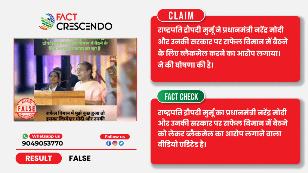 तथ्य-जांच के बाद हमने पाया कि, राष्ट्रपति द्रौपदी मुर्मू का प्रधानमंत्री नरेंद्र मोदी और उनकी सरकार पर राफेल विमान में बैठने को लेकर ब्लैकमेल का आरोप लगाने वाला वायरल वीडियो डिजिटल रूप से एडिटेड है।