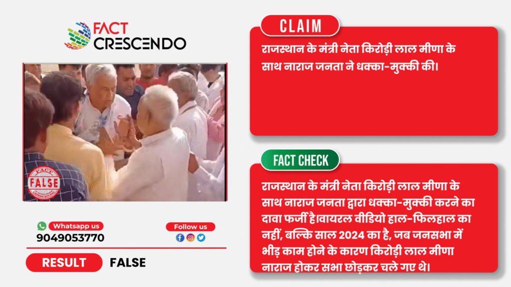 सोशल मीडिया पर राजस्थान के कृषि मंत्री डॉ. किरोड़ी लाल मीणा का एक वीडियो वायरल हो रहा है। वीडियो किसी जनसभा का है जहां मीणा को लोगों के बीच से जाते हुए देखा जा सकता है। यह वीडियो देखने से ऐसा लगता है कि मीणा नाराज हैं और सभा छोड़कर जा रहे हैं। वीडियो को हालिया बताकर शेयर करते हुए दावा किया जा रहा है कि राजस्थान में जनता बीजेपी सरकार से नाराज है और इसलिए बीजेपी के कैबिनेट मंत्री किरोड़ी लाल मीणा के साथ लोगों ने धक्का-मुक्की की।