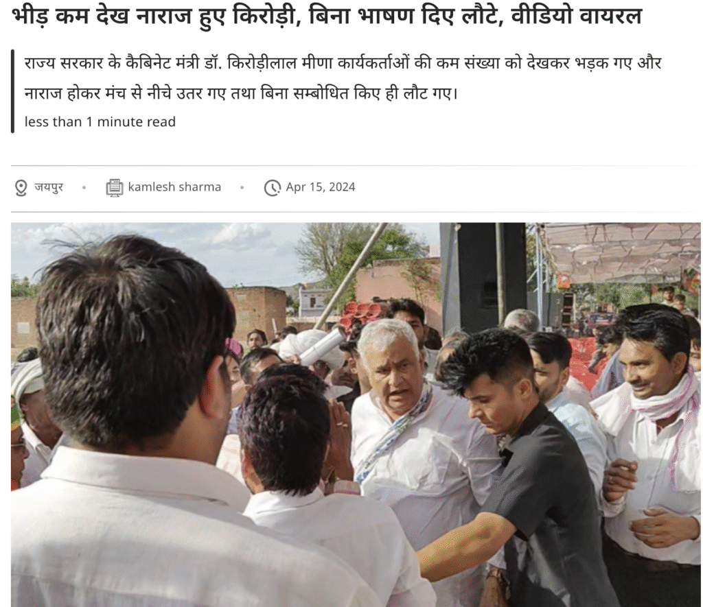 इस बारे में पत्रिका में भी वायरल वीडियो की खबर छपी हुई थीं। खबर के अनुसार सभा में कम भीड़ देखकर मीणा आगबबूला हो गए थे। उन्होंने कार्यकर्ताओं को जमकर खरी-खोटी सुनाई थी और नाराजगी जाहिर करते हुए बिना भाषण दिए ही मंच से नीचे उतर गए थे। मंच से मीणा ने लोगों से कहा था, ‘नहीं दे रहा भाषण, जाओ अपने-अपने घर’।