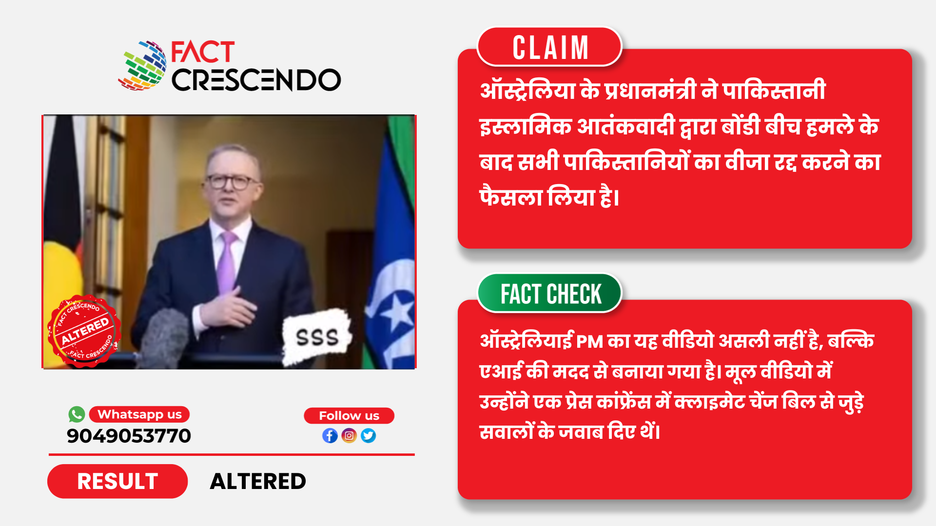 तथ्यों के जांच से यह पता चलता है कि ऑस्ट्रेलियाई प्रधानमंत्री ने बोंडी बीच हमले के बाद सभी पाकिस्तानी नागरिकों के वीजा रद्द करने का ऐलान नहीं किया है। उनके वायरल वीडियो को एआई की मदद से बनाया गया है। जबकि मूल वीडियो में उन्होंने एक प्रेस कांफ्रेंस में क्लाइमेट चेंज बिल से जुड़े सवालों के जवाब दिए हैं। उनके पुराने वीडियो को AI से तैयार कर हालिया व भ्रामक दावे से साझा किया जा रहा है।