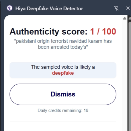 इसलिए वीडियो की प्रामाणिकता की अधिक पुष्टि के लिए, हमने Hiya के डीपफेक ऑडियो डिटेक्टर का उपयोग करके वीडियो का विश्लेषण किया , जिससे पता चला कि वॉयस ट्रैक कृत्रिम रूप से निर्मित है। इस प्रकार से यह सिद्ध हो गया कि यह एक डीपफेक वीडियो है, वास्तविक फुटेज नहीं।