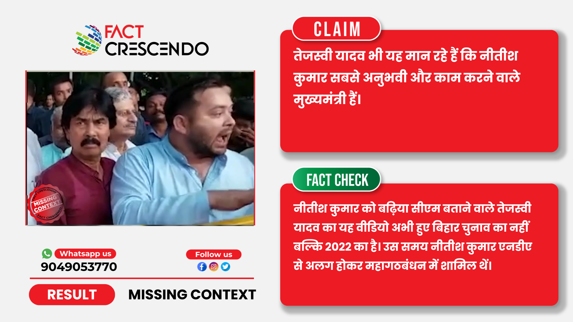 तथ्यों के जांच से यह पता चलता है कि, तेजस्वी के नीतीश कुमार को बढ़िया सीएम बताने के दावे से वायरल हो रहा यह वीडियो हाल फिलहाल का नहीं है। असल में यह वीडियो 2022 का है जब जेडीयू एनडीए से अलग हो कर महागठबंधन में शामिल हुआ था।