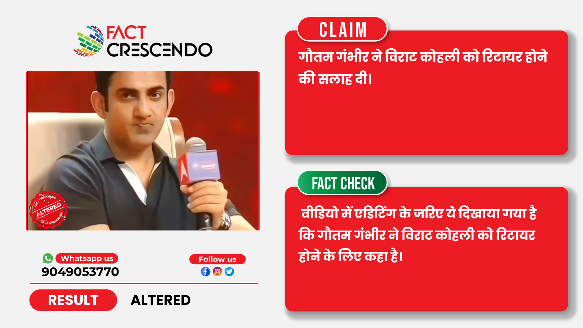 इसलिए यह प्रमाणित होता है कि विराट कोहली के रिटायरमेंट वाली बात गौतम गंभीर ने नहीं की। वायरल वीडियो संपादित किया गया है।