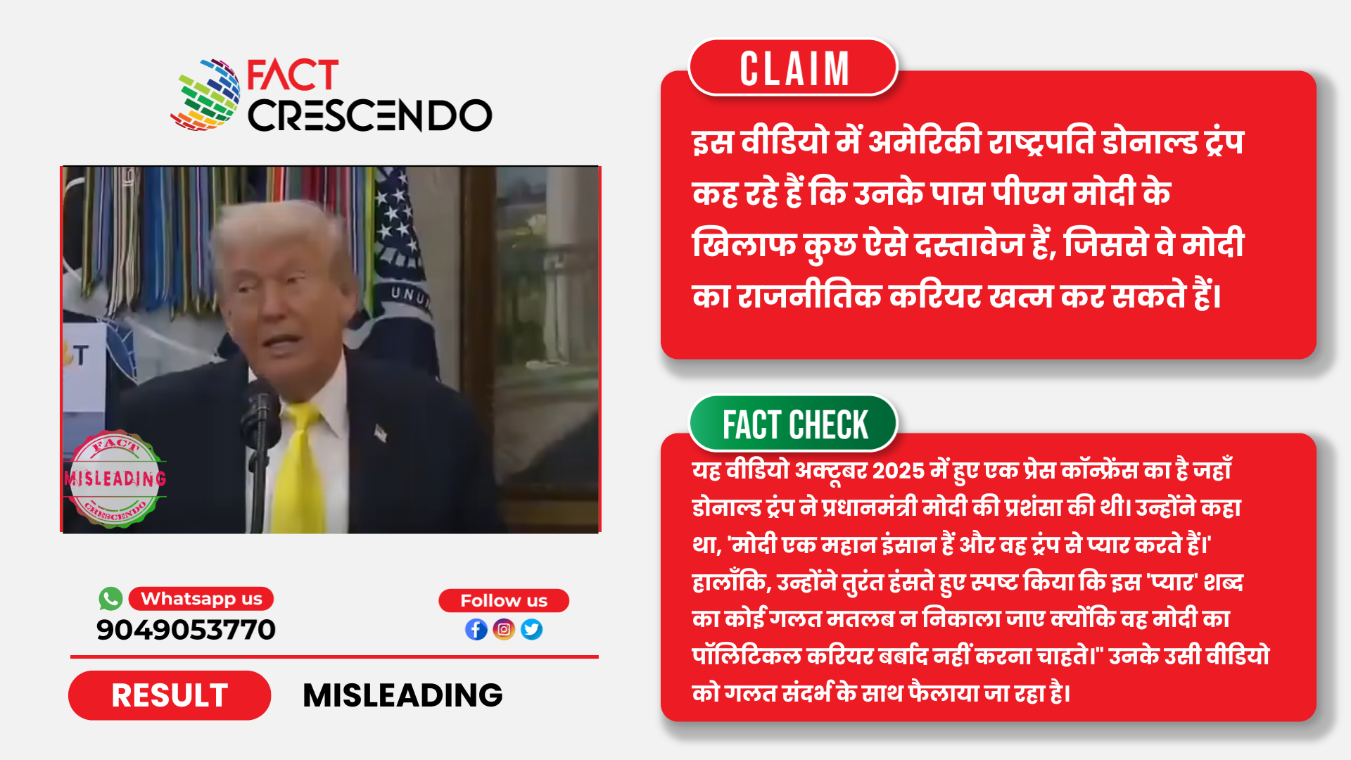 तथ्यों के जांच से पता चलता है कि पीएम मोदी के राजनीतिक करियर के बारे में ट्रंप का बयान बिना संदर्भ के साझा किया का रहा है। मूल वीडियो में, प्रधानमंत्री मोदी के करियर को ‘नष्ट’ करने के बारे में ट्रंप की टिप्पणी मज़ाक में की गई थी, जिसे संदर्भ से हटाकर भ्रामक रूप से धमकी के तौर पर फैलाया जा रहा है।