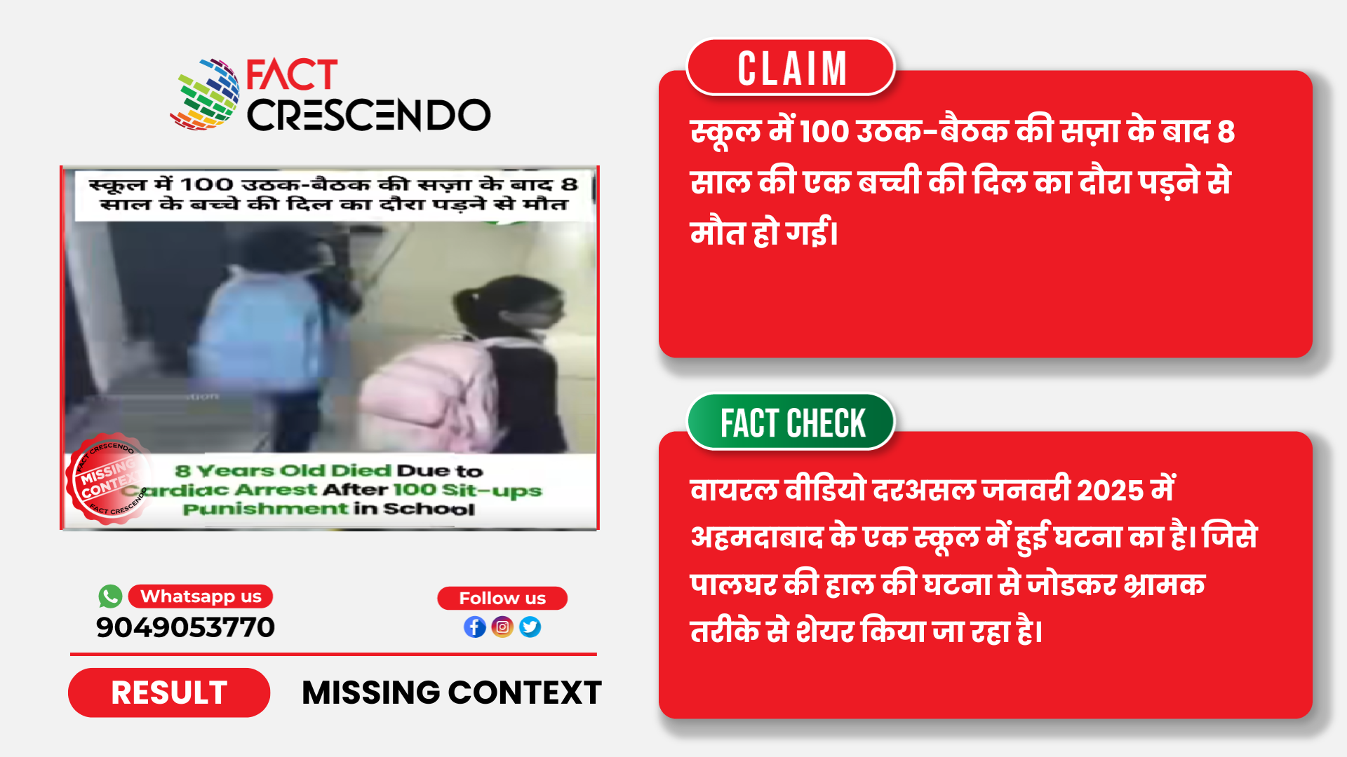 तथ्यों के जांच से यह स्पष्ट है कि, वायरल वीडियो दरअसल जनवरी 2025 में अहमदाबाद के एक स्कूल में हुई घटना का है। जिसे पालघर की हाल की घटना से जोडकर भ्रामक तरीके से शेयर किया जा रहा है।