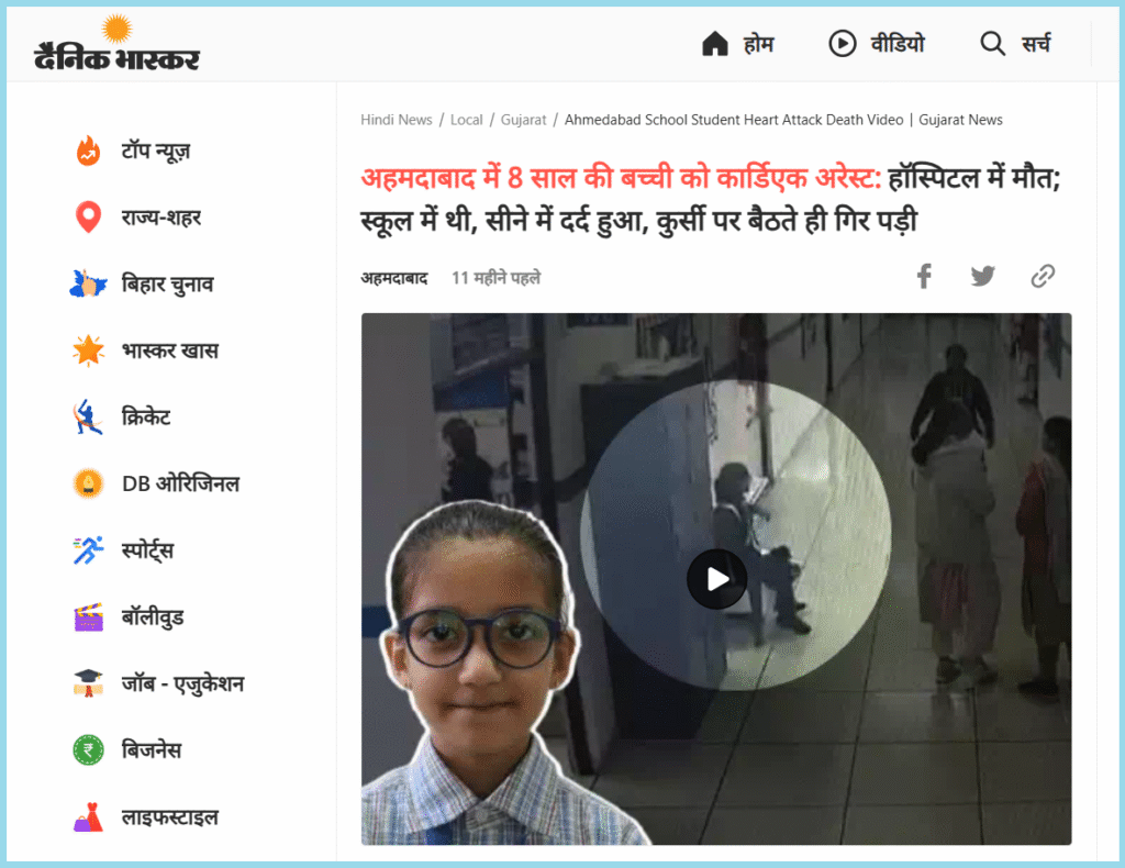 दिव्य भास्कर ने जनवरी 2025 में प्रकाशित एक रिपोर्ट में यही वीडियो साझा किया था। रिपोर्ट के अनुसार, “गुजरात के अहमदाबाद के थलतेज क्षेत्र में तीसरी कक्षा की 8 वर्षीय छात्रा की स्कूल में अचानक तबीयत बिगड़ने से मौत हो गई। बताया गया कि बच्ची की छाती में तेज़ दर्द हुआ, जिसके बाद वह लॉबी में रखी कुर्सी पर बैठी-बैठी अचानक गिर पड़ी। स्कूल स्टाफ ने तुरंत उसे अस्पताल पहुँचाया, लेकिन डॉक्टरों ने उपचार के दौरान उसे मृत घोषित कर दिया। प्रारंभिक जांच में आशंका जताई गई कि उसकी मौत हृदयाघात के कारण हुई।”