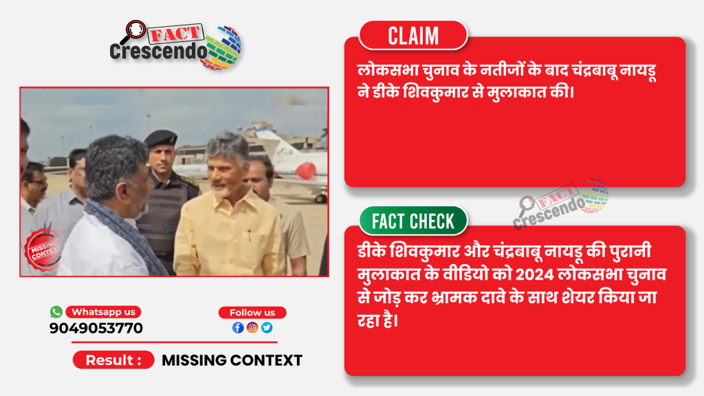 तथ्य-जांच के बाद हमने पाया कि, डीके शिवकुमार और चंद्रबाबू नायडू के पुरानी मुलाकात के वीडियो को 2024 लोकसभा चुनाव से जोड़ कर भ्रामक दावे के साथ शेयर किया जा रहा है।
