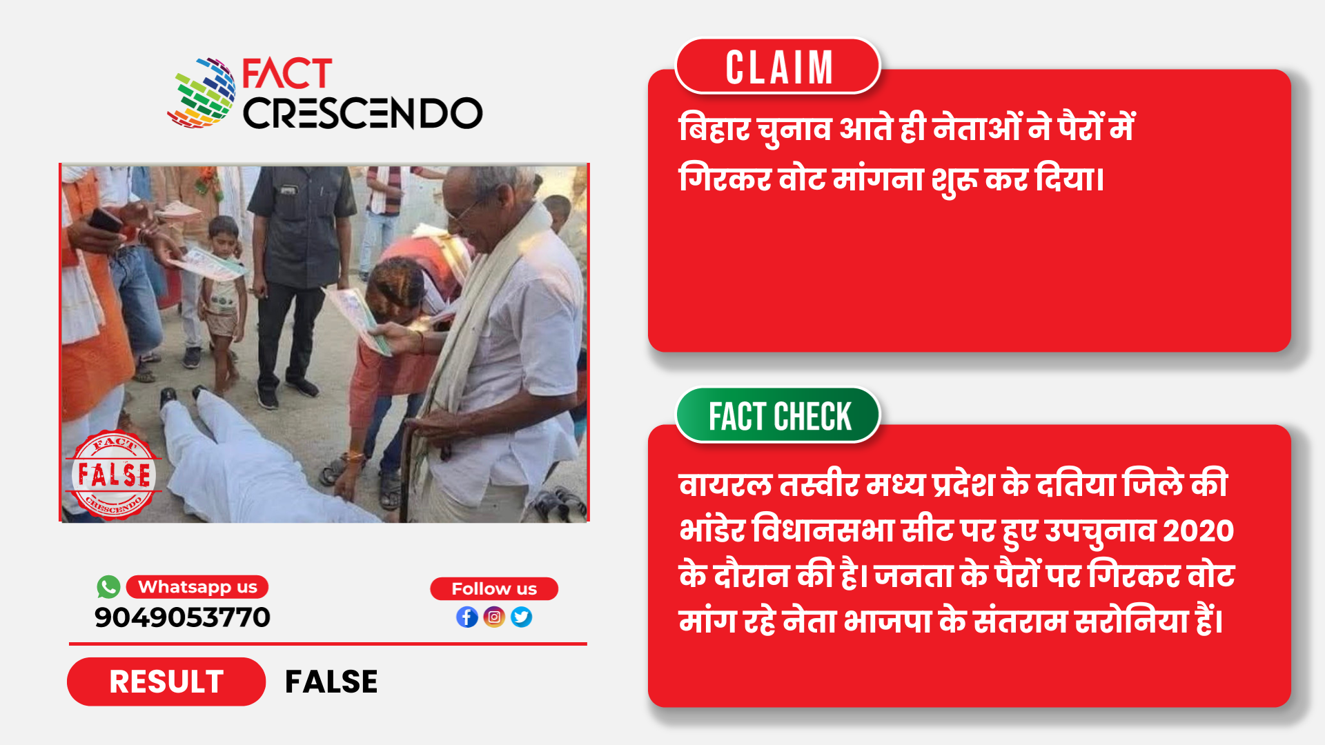 निष्कर्ष- तथ्य-जांच के बाद हमने पाया कि, वायरल तस्वीर मध्य प्रदेश के दतिया जिले की भांडेर विधान सभा सीट पर हुए उपचुनाव 2020 के दौरान की है। जनता के पैरों पर गिरकर वोट मांग रहे नेता भाजपा के संतराम सरोनिया हैं व इस तस्वीर का बिहार में होने जा रहे चुनाव से कोई संबंध नहीं है।