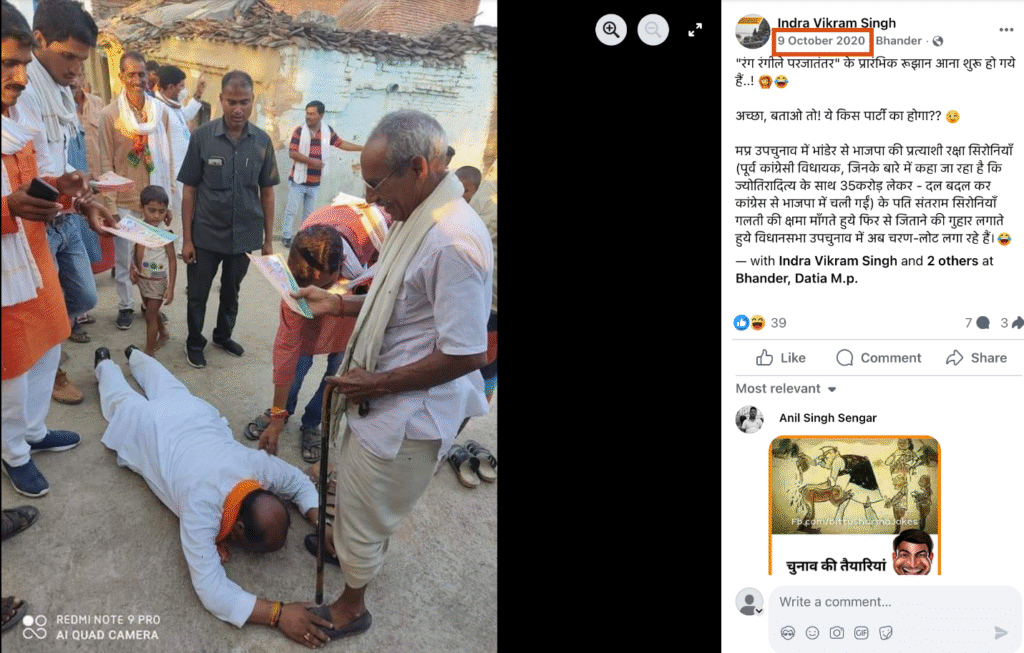 अपनी जांच में हमें एक्स पर 9 अक्टूबर 2020 को अपलोड की गई तस्वीर मिली, जिसमें जमीन पर दंडवत लेटे नेता को संतराम सरोनिया बताया गया है।