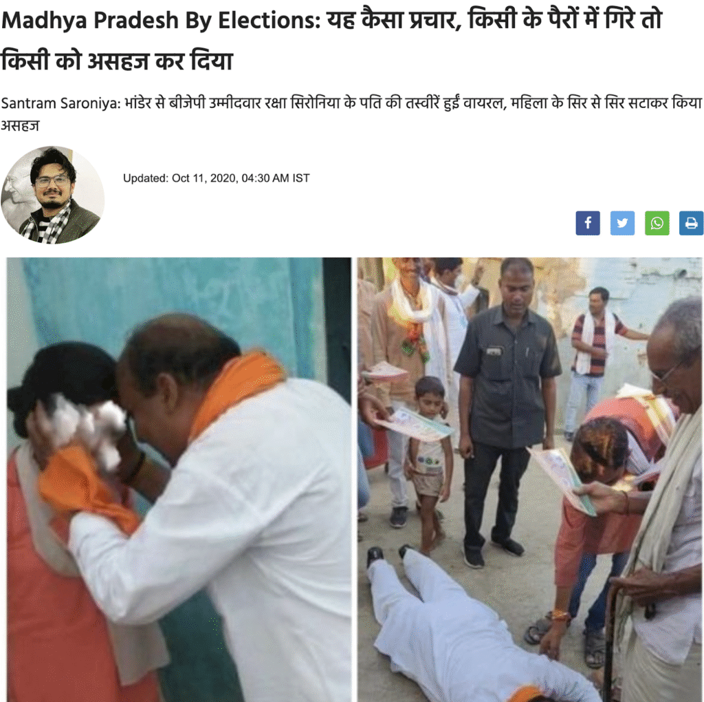 मिली जानकारी की मदद लेते हुए अधिक सर्च करने पर वायरल तस्वीर हमें humsamvet की वेबसाइट पर मिली। 11 अक्टूबर 2020 को प्रकाशित रिपोर्ट के अनुसार, “मध्य प्रदेश के भांडेर विधानसभा क्षेत्र से बीजेपी उम्मीदवार रक्षा सिरोनिया के पति संतराम सिरोनिया की कई तस्वीरें सोशल मीडिया पर वायरल हो रही हैं।