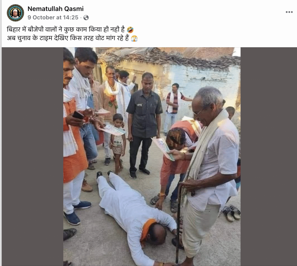 सोशल मीडिया पर एक शख्स की तस्वीर वायरल हो रही है, जिसमें सफेद कुर्ता पायजामा पहना हुआ आदमी एक बुजुर्ग के पैरों पर गिरता हुआ दिखाई दे रहा है। इस तस्वीर को 2025 के बिहार विधानसभा चुनाव से जोड़कर दावा किया जा रहा है कि चुनाव आते ही नेता लोगों के पैरों में गिरकर वोट की भीख मांगने लगे हैं।