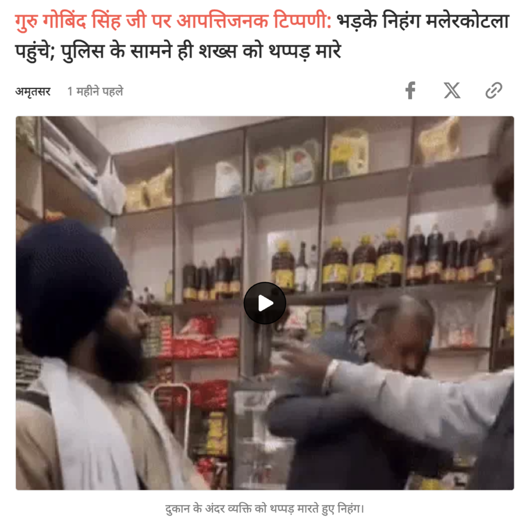 वायरल वीडियो के साथ यूजर ने लिखा है- सिक्खों की दादागिरी हिंदुओं पर ….कुछ साल पहले एक गरीब लाचार बच्चा  किसी गुरुद्वारा के घुस गया लंगर खाने के लालच में रात में , क्योंकि वो भूखा था ….खाना तो नही मिला गरीब बच्चा को लेकिन निंले घाघरे वालो ने बच्चा को चोर बताकर पिट पिट कर मार दिया क्योंकि वो एक हिन्दू लड़का था …अब पांच दीन पहले एक मुसलमान ने उसके गुरुद्वारा के अंदर घुसकर उसके तालाब में कुल्ला किया पैर धोया थूका तालाब में फिर नमाज पढ़ा ….अमृतसर के स्वर्ण मंदिर के पवित्र सरोवर को कुल्ला करके गंदा करने वाले हाथ पैर धोने वाले और तोहिद का निशान यानी एकमात्र अल्लाह ही सर्वश्रेष्ठ है दिखाने वाले मुस्लिम की दुकान पर कुछ निहंग पहुंचे…..उसने माफी मांग लिया………… और निहंग लोगों ने माफ कर दिया….#