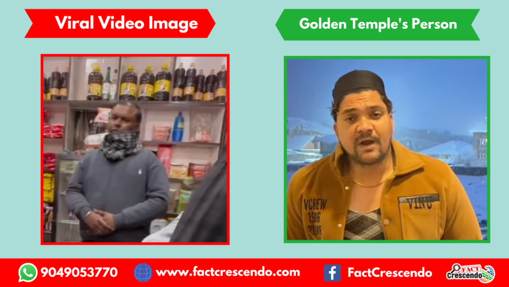 सोशल मीडिया पर एक वीडियो वायरल हो रहा है। इसमें कुछ लोगों को एक शख्‍स को थप्‍पड़ मारते हुए देखा जा सकता है। शख्स एक दुकान में हाथ जोड़े खड़ा दिख रहा है। इस वीडियो के साथ दावा किया जा  रहा  हैं कि जिस शख्‍स को थप्‍पड़ मारा गया, वह मुस्लिम है। इसने कुछ दिन पहले अमृतसर के स्वर्ण मंदिर के पवित्र सरोवर में कुल्ला किया था।