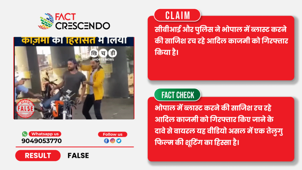 निष्कर्ष– तथ्य-जांच के बाद हमने पाया कि, भोपाल में ब्लास्ट करने की साजिश रच रहे आदिल काजमी को गिरफ्तार किए जाने के दावे से वायरल यह वीडियो असल में एक तेलुगु फिल्म की शूटिंग का हिस्सा है।