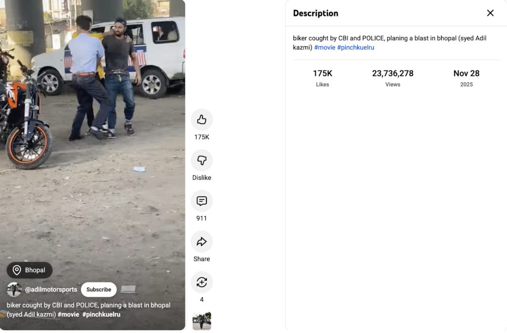 पड़ताल की शुरुआत में हमने वायरल वीडियो के तस्वीरों का रिवर्स इमेज सर्च किया, परिणाम में वायरल वीडियो हमें adimotorsports नाम के एक यूट्यूब अकाउंट पर मिला। यहां पर वीडियो को 28 नवंबर 2025 को अपलोड किया गया था। वीडियो के साथ मौजूद कैप्शन में लिखा हुआ था, “सीबीआई और पुलिस ने बाइकर को पकड़ा, भोपाल में धमाके की प्लानिंग कर रहा था (सैयद आदिल काज़मी) #मूवी #पिंचकुएलरु”।